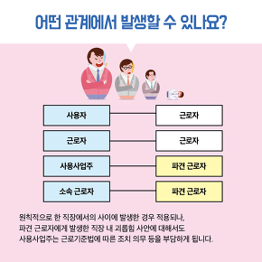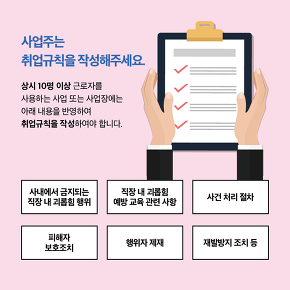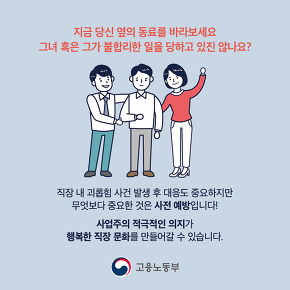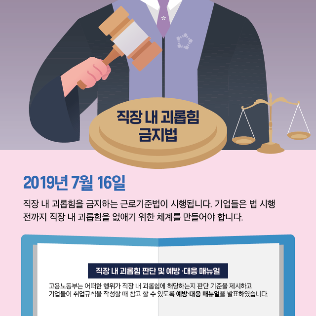 직장 내 괴롭힘 금지법이 오는 16일부터 시행됩니다. 근로자가 직장에서 지위 또는 관계 우위를 이용해 다른 근로자에게 신체적 정신적 고통을 주는 행위 등을 금지하겠다는 취지인데요. 직장 내 괴롭힘 금지법은 태움이라 불리는 간호사 간 괴롭힘, 웹하드 업체의 직원 폭행 등 사회적 이슈가 커진 뒤 급속도로 진행되었습니다. 근로기준법에 새롭게 추가된 직장 내 괴롭힘 금지법은 매일 출근해서 일하는 근로자가 5인 이상인 기업에서는 모두 적용됩니다. 근로자가 10인 이상인 기업은 회사 취업규칙에 직장 내 괴롭힘 금지법에 대한 내용을 반영해야 합니다.
