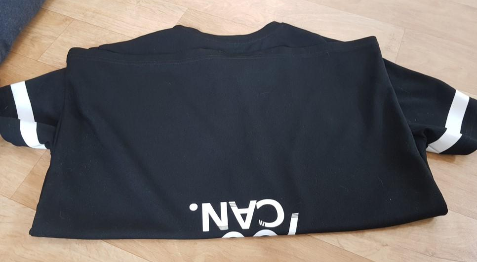 1. 티를 무늬가 없는뒤쪽으로 놔주시구요 몸통부분을 위에 사진처럼 어깨선에 맞춰 접어줍니다.
