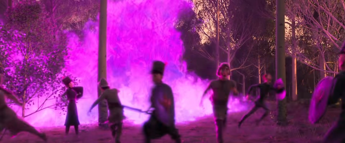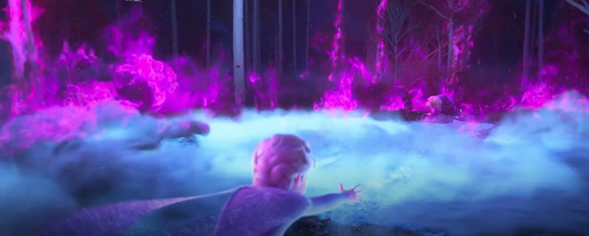 다시 2차 공식 예고편으로 돌아와보자. “마법의 숲은 황홀한 공간이었어. 하지만 잘못된 길로 가기 시작했지. 그때부터 누구도 그 숲에 드나들 수 없었단다” 아그나르 왕의 대사와 함께 혼란에 빠진 마법의 숲이 등장한다. 노불드라로 추정되는 이들과 아렌델 왕국의 제복을 입고 있는 이들이 서로에게 칼을 겨누는 장면, 마법의 숲이 현재 아렌델 왕국을 위협하는 핑크빛 불로 뒤덮이고 모두가 도망가는 장면, 그리고 숲이 강한 바람으로 모두를 쫓아내는 장면이 연이어 이어진다.