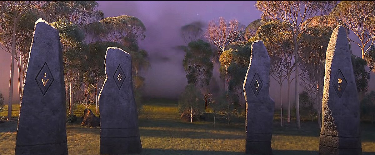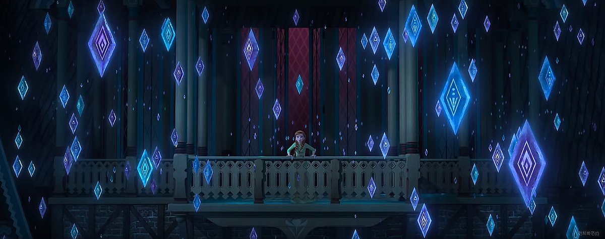 흥미로운 건 디즈니가 <겨울왕국 2>의 티저 포스터를 통해 이미 4가지 정령에 대한 힌트를 제공했다는 것. 티저 포스터의 눈 결정체엔 각각 다른 문양이 새겨져 있다. 엘사가 숲의 정령들을 깨우며 만들어낸 수백 개의 다이아몬드들이 바로 그것. 예고편 속 마법의 숲 입구를 지키는 네 개의 돌기둥에서도 이와 같은 문양을 확인할 수 있다.