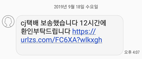 따라서 알 수 없는 단어로 문자 메시지가 오거나 택배조회 그 밖에도 모바일 상품권, 승차권, 공연 예매권 등 출처가 확실하지 않은 인터넷 주소는 절대 클릭하지 않아야 합니다.