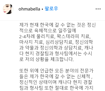 한국에 갈 수 없다는 정신적 육체적 이유를 들면서 일주일에 4차례정도 물리치료와 왁스테라피 치료 그리고 마사지 치료등 심리상담 치료와 정신 약물을 투여 하는등 여러가지 피해 사실을 알려왔습니다.